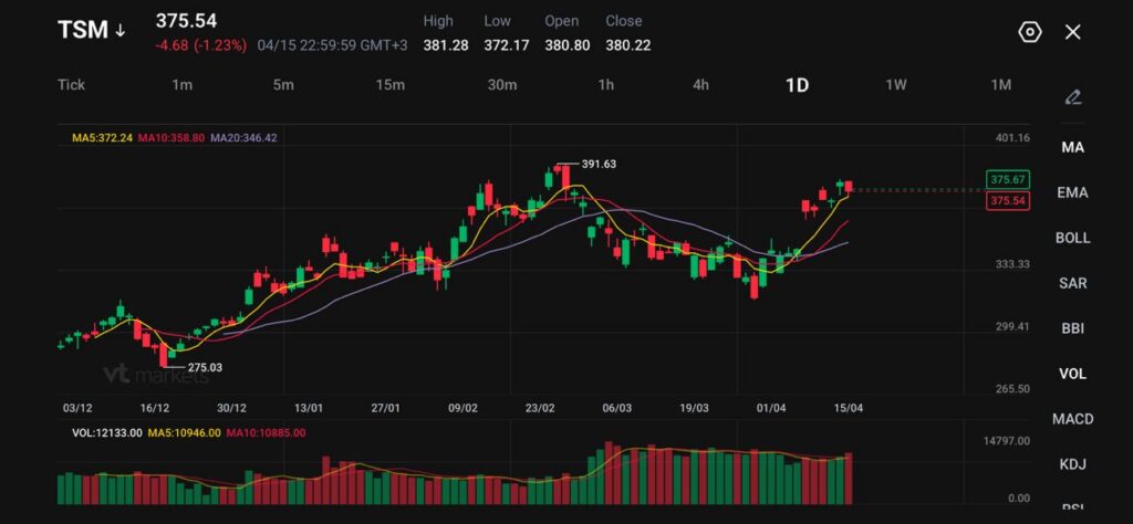 TSM saat ini sedang konsolidasi (consolidation: harga bergerak sempit/sideways) tepat di bawah resistance 380,00. Jika menembus bersih di atas area ini, harga bisa bergerak menuju puncak sebelumnya dekat 391,60, dan bisa lanjut naik jika tekanan beli meningkat.