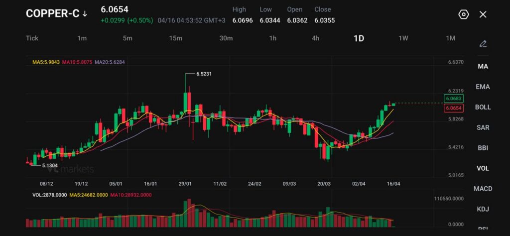 Tembaga diperdagangkan dekat 6,06, melanjutkan pemulihan setelah memantul dari level rendah terbaru di sekitar 5,42, dengan harga kini memasuki area resistance (hambatan harga, area tempat kenaikan sering tertahan) jangka pendek.