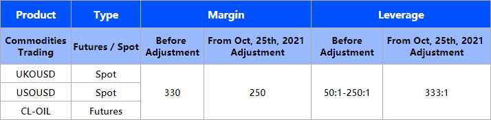 After the modification, the margin request for trading the Oil contracts will be reduced to two-thirds of its current amount. The leverage of Oil contracts will also be raised and fixed at 333:1 instead of floating between 50:1 and 250:1.