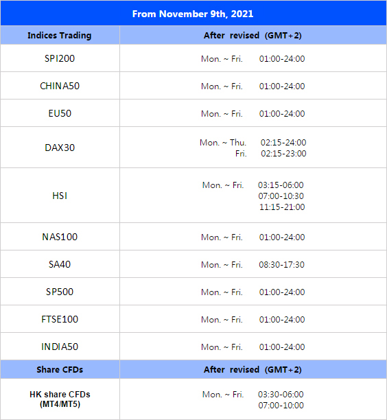 VT Markets is devoted to offering a favorable trading environment to our clients. After a punctilious assessment, from Nov. 9th, 2021, the trading hours of following products will changed.