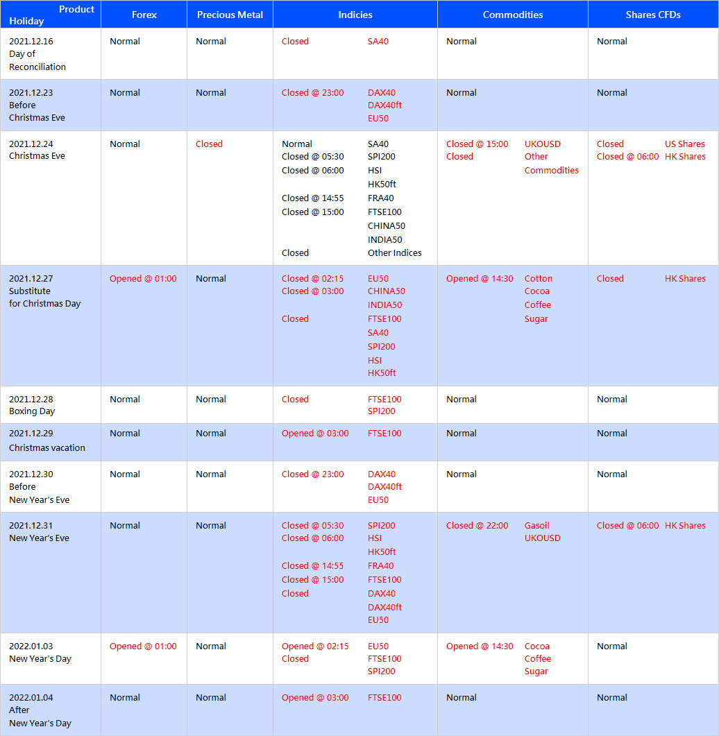 Please note the adjustment on following products due to international holiday in December: