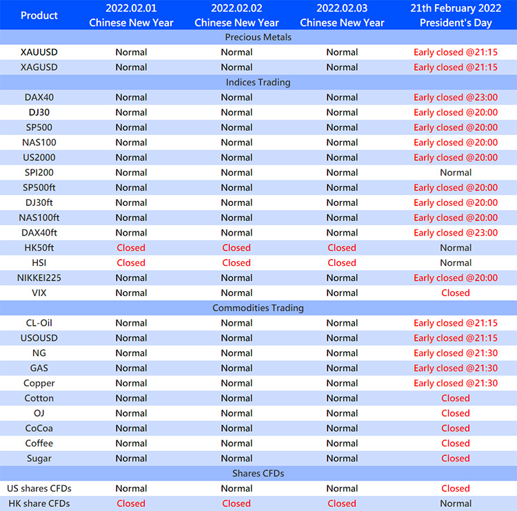 The above time is MT4/5 server time. The trading time of other products is not affected. The above data may be subject to change. Please refer to the actual time on MT4/5.