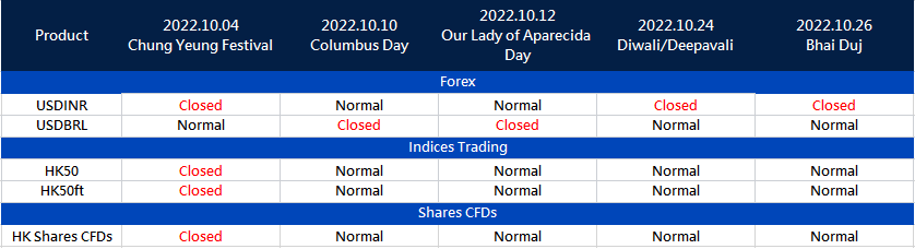 Please note the adjustment on the following products due to the international holiday in October: