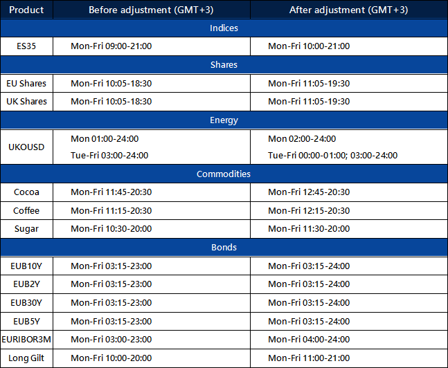 Starting from October 27, 2024, the trading hours of some MT4/MT5 products will change due to the upcoming Daylight Saving Time change in the EU/UK.