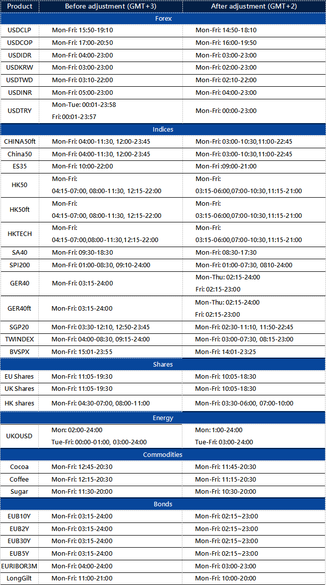 Starting from November 3, 2024, the trading hours of some MT4/MT5 products will change due to the upcoming Daylight Saving Time change in the US.