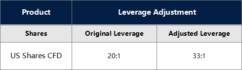 1. All US Shares products leverage will be adjusted to 33:1.