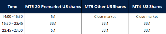 2. 20 Premarket US shares on MT5: Leverage will be 5:1 during 14:00-16:30 and 22:45-23:00; and remain 33:1 during the rest of the trading time.