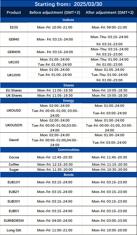The trading hours of some MT5 products will change due to the upcoming Daylight Saving Time change in the EU/UK. Please refer to the table below outlining the affected instruments: